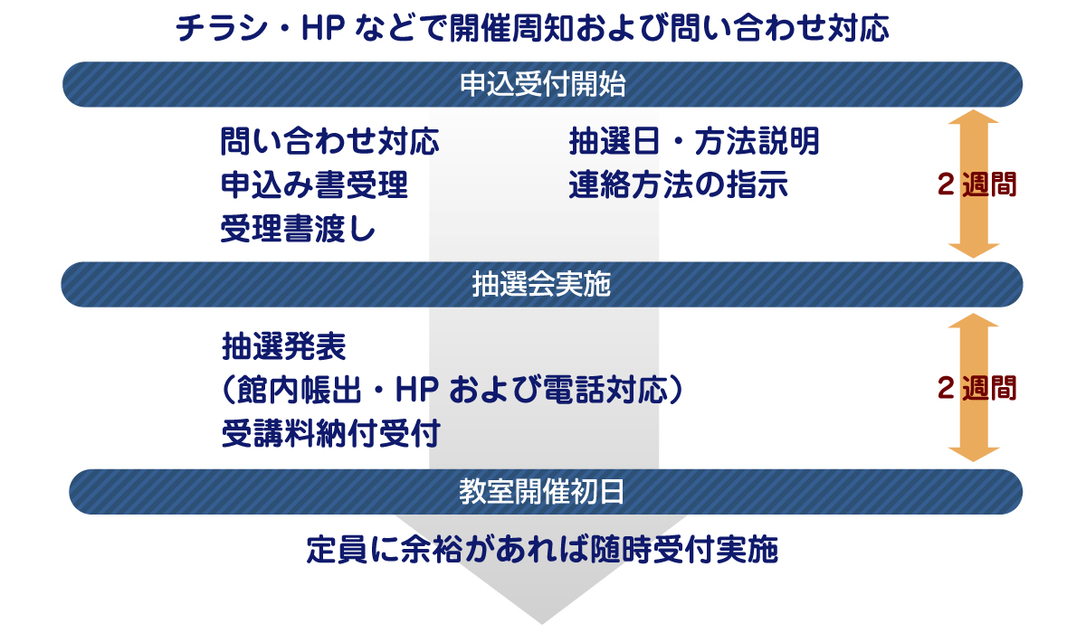 開講後、定員に空きがある場合、随時申込みを受付いたします。空き状況については、窓口にお問合せください。